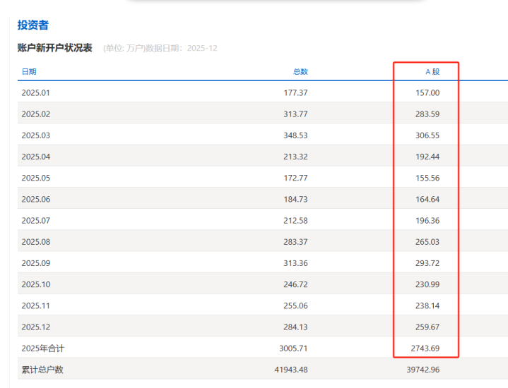 数据显示,A股新开户数在近两年稳步攀升:2024年新开户2499.89万户,较2023年的2144.36万户增长约16.6%;2025年进一步增长至2743.69万户,同比增长9.75%,延续增长势头。